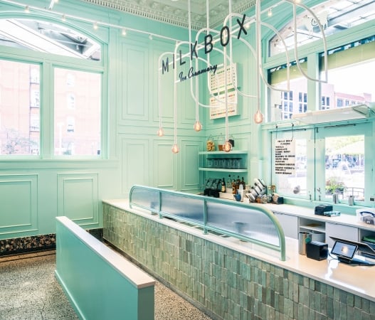 Filled with sunlight and a mint green hue that reminds us of mint chocolate chip ice cream, Milkbox Ice Creamery is once again scooping delicious hand-crafted ice cream inside Denver Union Station.